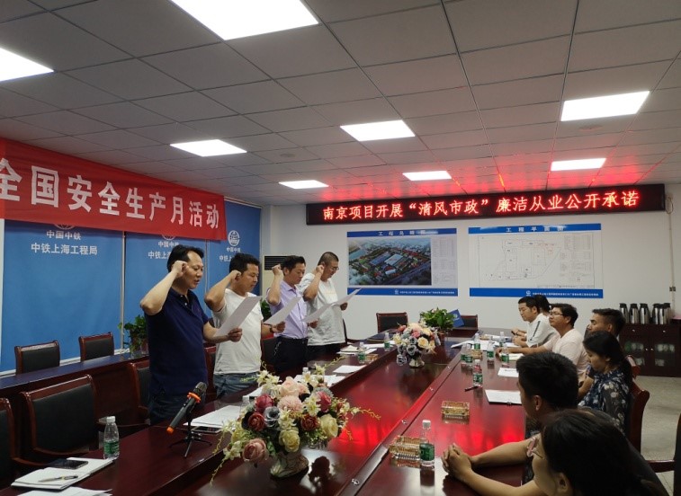 南京浦口水廠改擴建項目部組織開展項目領導人員廉潔從業公開承諾活動。612日,南京工程項目黨支部組織浦口水廠改擴建項目部領導人員開展廉潔從業公開承諾活動,項目部全體員工參加。會上,項目黨支部副書記關立華傳達學習了公司黨委關于開展“清風市政”廉潔主題宣傳教育活動的通知,接著組織全體員工觀看了廉潔教育警示片《沉淪》,通過違紀違規受到懲處的真實案例,警示大家進一步增強紀律意識、規矩意識和責任意識,自覺做到遵規守紀、廉潔從業。隨后,項目部領導班子成員在全體員工面前進行廉潔從業公開承諾,并在承諾公示牌上逐一簽名。會后,項目黨支部將領導人員的廉潔從業承諾書在駐地黨務公開欄進行公示,廣泛接受職工群眾監督。劉圣濤